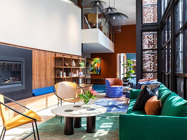The common spaces designed by Louise Spicer of Onefour Interiors beg me to go on a sensory journey filled with vibrant pops of colour, myriad textures and the artistic flair of the likes of Larissa Blake and Lara Scolari.